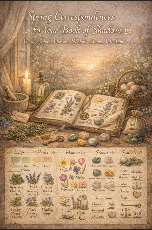 When you add spring correspondences to your Book of Shadows, you are doing more than making a list. You are creating a doorway into the season. A way to remember what this time of year feels like in your body, your home, your spirit, and your practice.